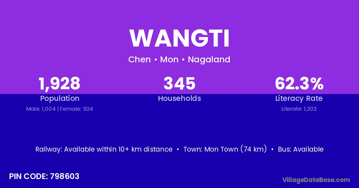 Wangti village has a total population of 1,928 people, of which 1,004 are males and 924 are females.