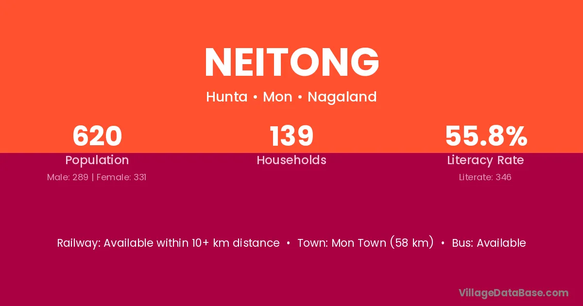 Mon Town (58 km) is the nearest town to Neitong village for major economic activities and is located approximately 58 km away.