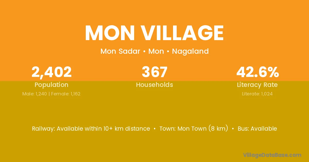 The literacy rate of Mon Village village is 42.63%. Male literacy stands at 46.37% and female literacy at 38.64%.