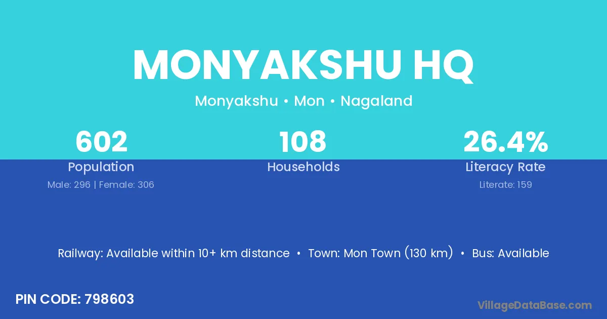 Monyakshu Hq village has a total population of 602 people, of which 296 are males and 306 are females.