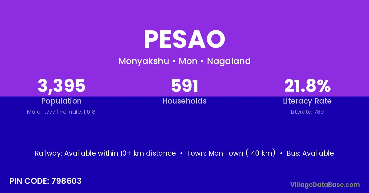 Mon Town (140 km) is the nearest town to Pesao village for major economic activities and is located approximately 140 km away.