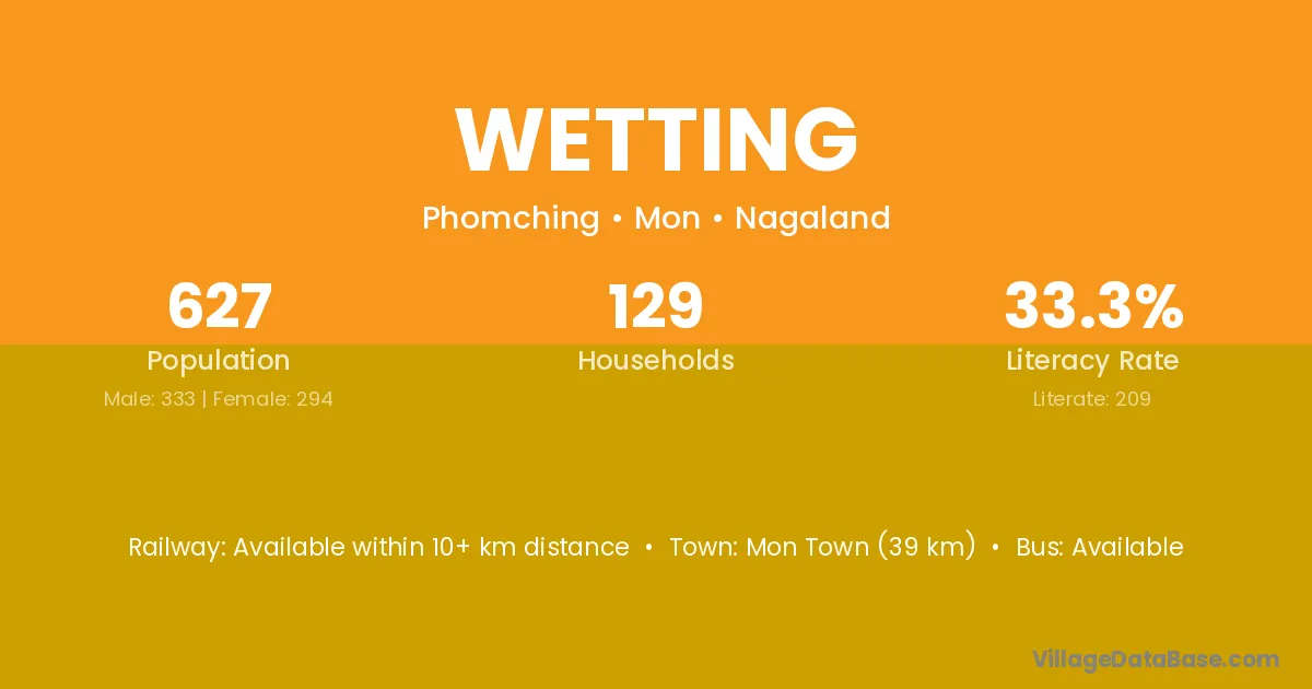Mon Town (39 km) is the nearest town to Wetting village for major economic activities and is located approximately 39 km away.