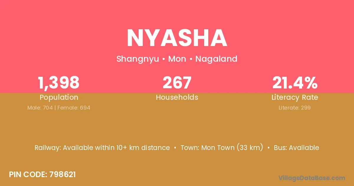 Nyasha village has a total population of 1,398 people, of which 704 are males and 694 are females.
