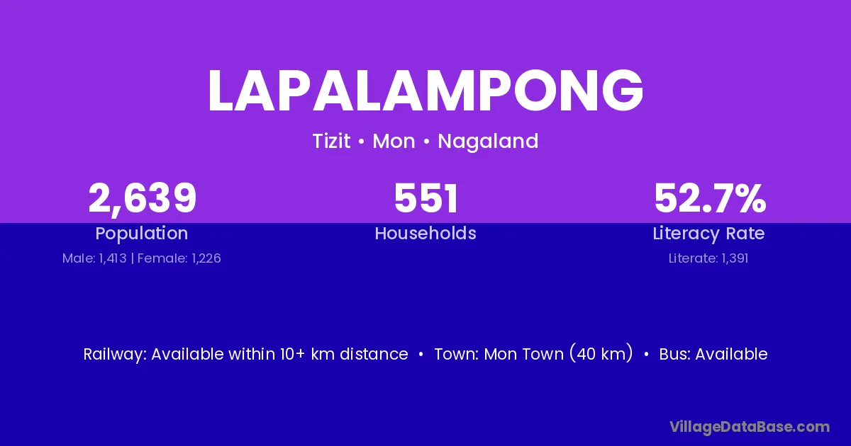 Lapalampong village has a total population of 2,639 people, of which 1,413 are males and 1,226 are females.