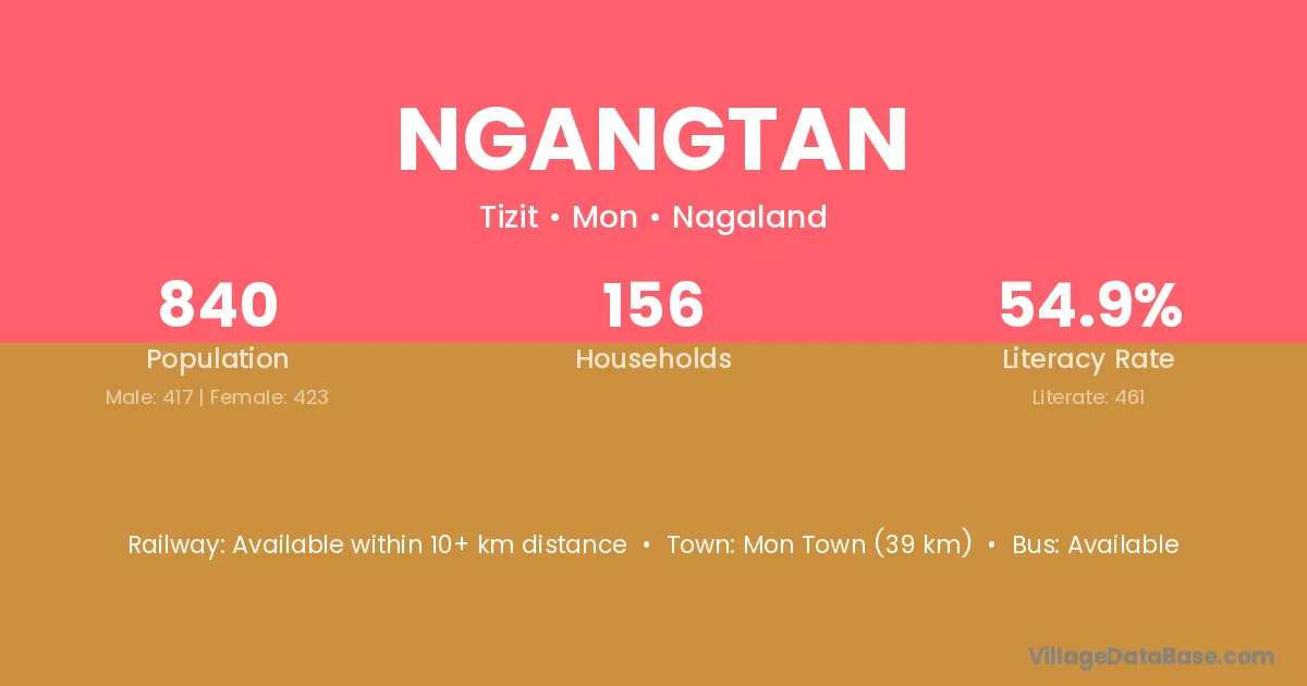Ngangtan village has a total population of 840 people, of which 417 are males and 423 are females.