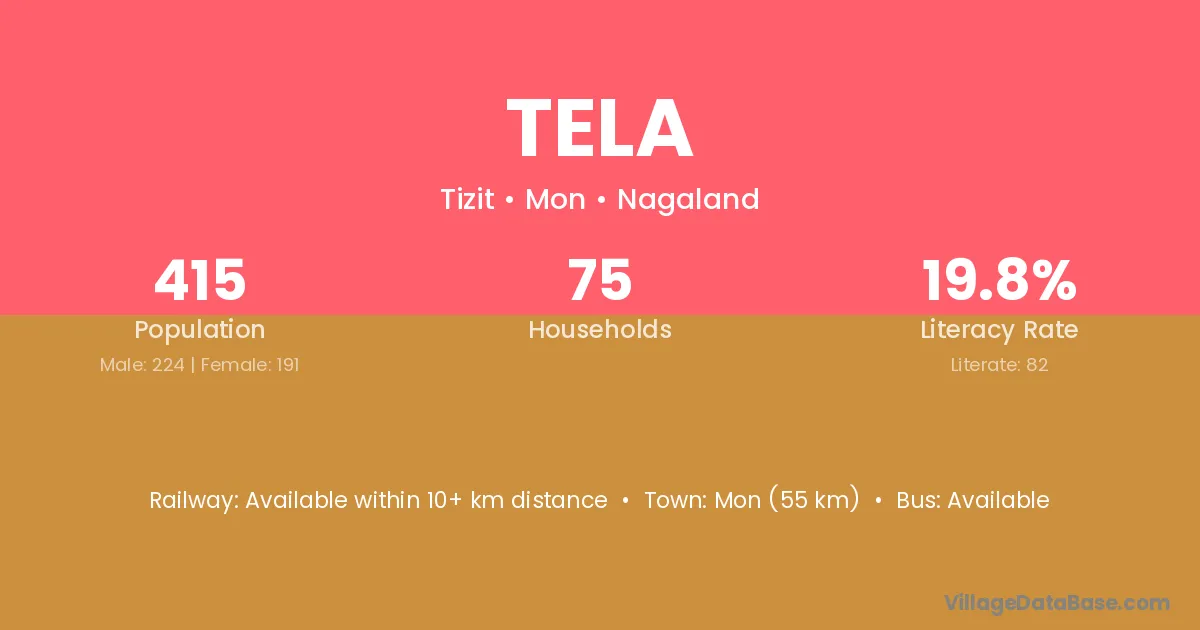 Mon (55 km) is the nearest town to Tela village for major economic activities and is located approximately 55 km away.