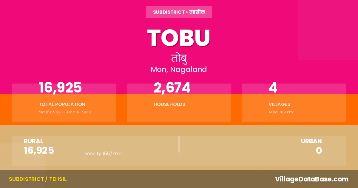 Tobu is a town and Circle in the Mon district of the Nagaland. In India, a Circle is a subdivision of a district responsible for the administration and revenue collection of a specific area within the district. Circles play a crucial role in the local governance structure, contributing significantly to the development and administration of their communities.