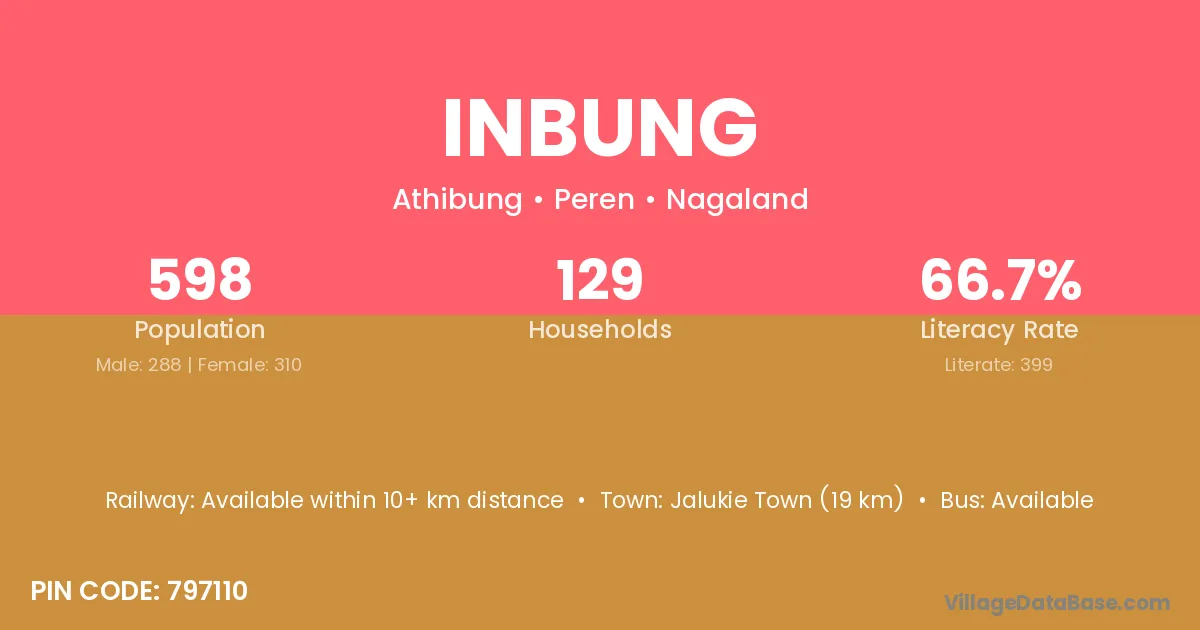 Jalukie Town (19 km) is the nearest town to Inbung village for major economic activities and is located approximately 19 km away.