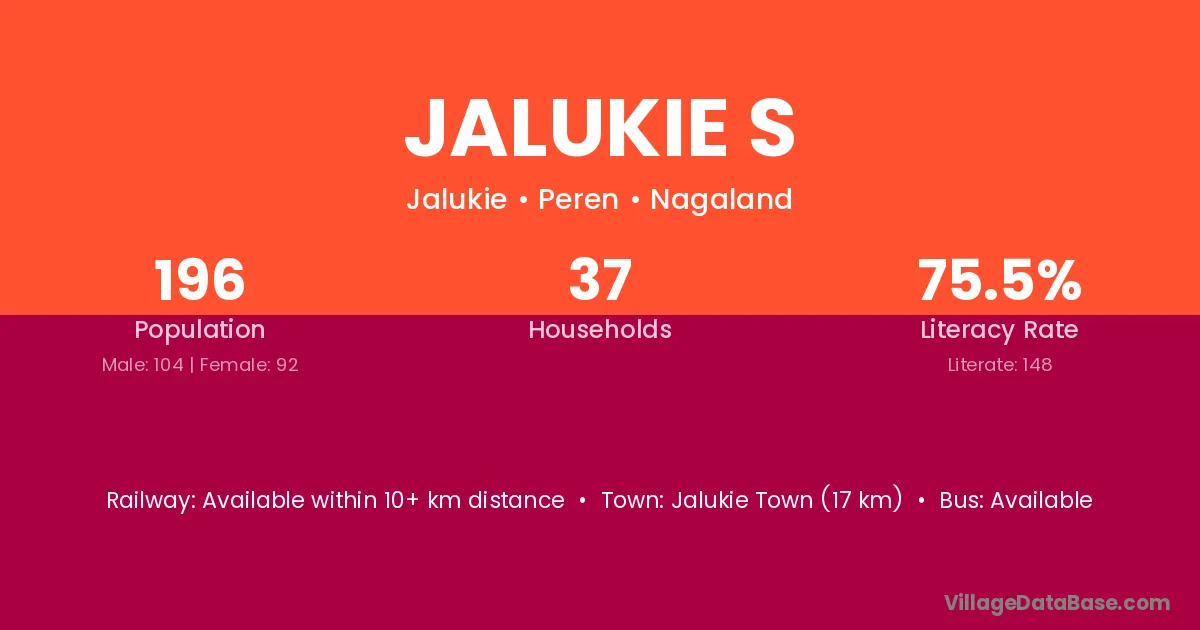 Jalukie S village has a total population of 196 people, of which 104 are males and 92 are females.
