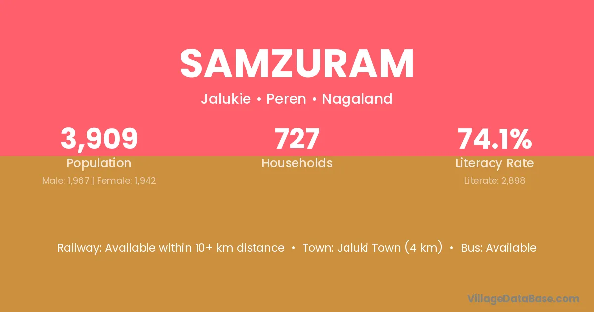 Samzuram village has a total population of 3,909 people, of which 1,967 are males and 1,942 are females.