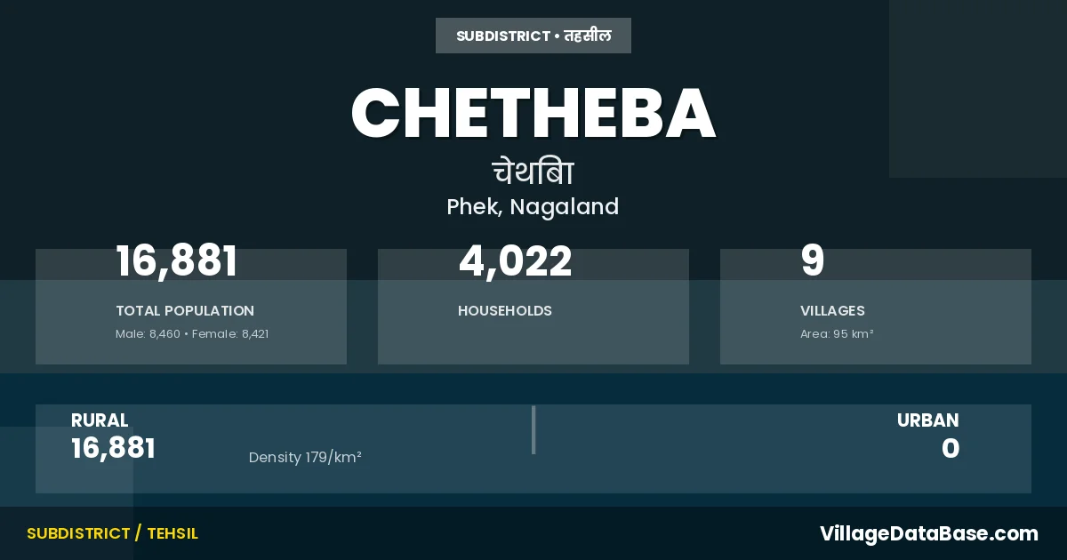 Chetheba is a town and Circle in the Phek district of the Nagaland. In India, a Circle is a subdivision of a district responsible for the administration and revenue collection of a specific area within the district. Circles play a crucial role in the local governance structure, contributing significantly to the development and administration of their communities.