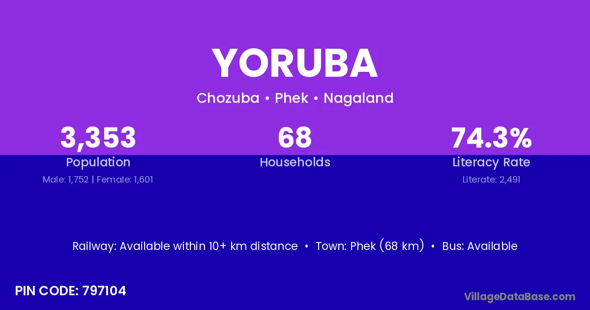 Phek (68 km) is the nearest town to Yoruba village for major economic activities and is located approximately 68 km away.