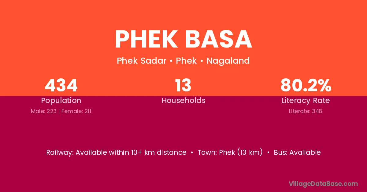 The literacy rate of Phek Basa village is 80.18%. Male literacy stands at 80.72% and female literacy at 79.62%.