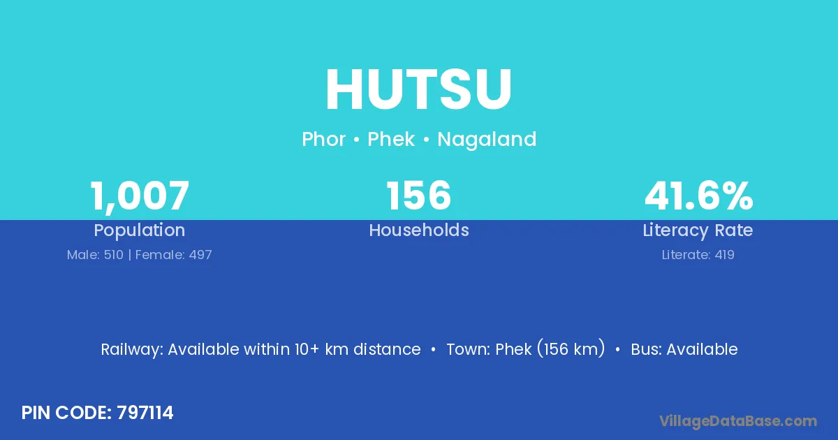 Hutsu village has a total population of 1,007 people, of which 510 are males and 497 are females.
