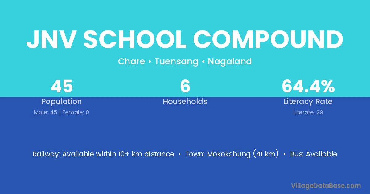 Mokokchung (41 km) is the nearest town to Jnv School Compound village for major economic activities and is located approximately 41 km away.