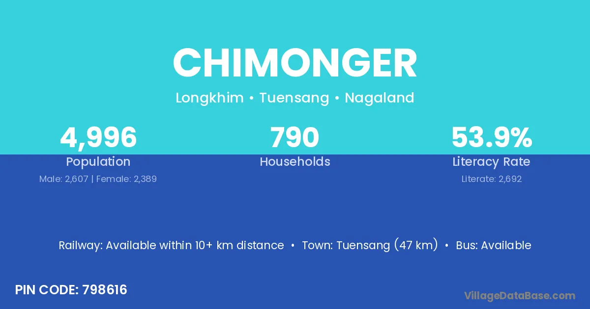 Tuensang (47 km) is the nearest town to Chimonger village for major economic activities and is located approximately 47 km away.