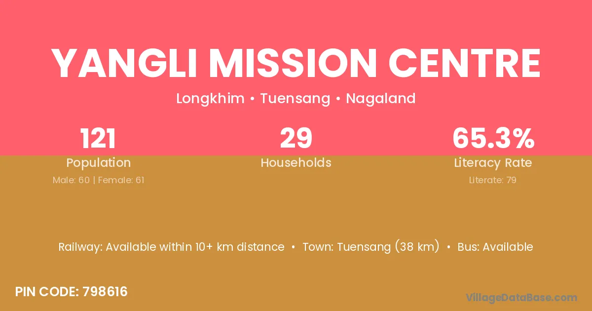 Yangli Mission Centre village has a total population of 121 people, of which 60 are males and 61 are females.