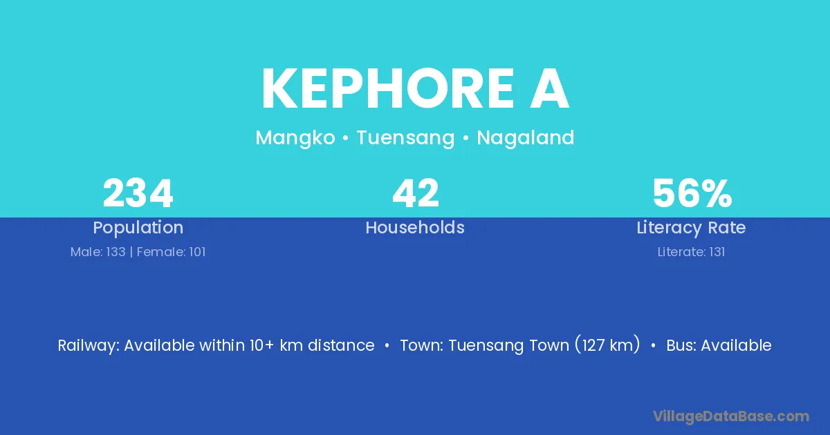 Tuensang Town (127 km) is the nearest town to Kephore A village for major economic activities and is located approximately 127 km away.