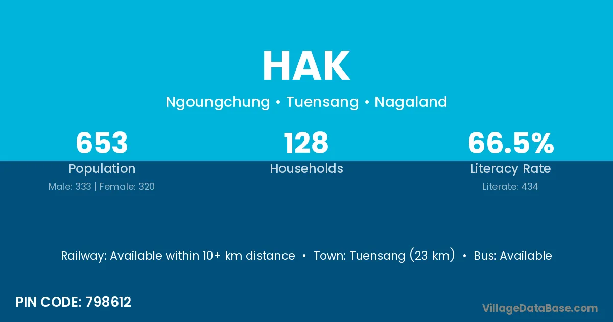 Tuensang (23 km) is the nearest town to Hak village for major economic activities and is located approximately 23 km away.