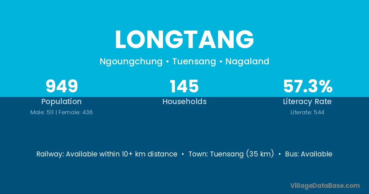 Tuensang (35 km) is the nearest town to Longtang village for major economic activities and is located approximately 35 km away.