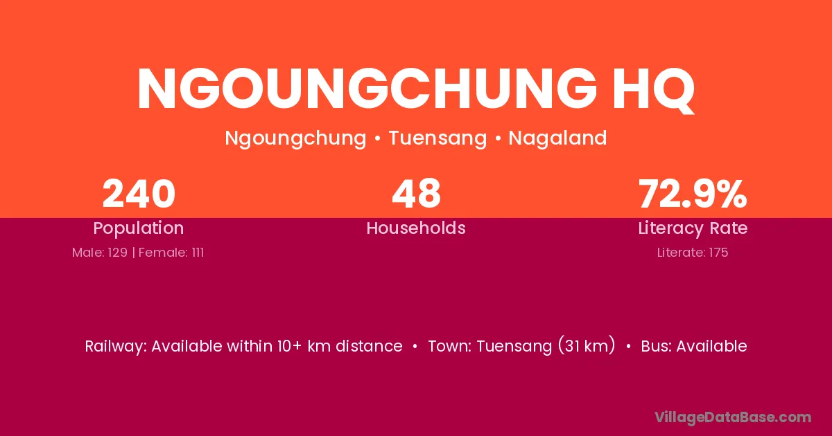 Ngoungchung Hq village has a total population of 240 people, of which 129 are males and 111 are females.
