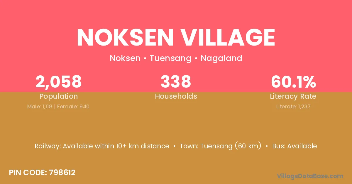 Tuensang (60 km) is the nearest town to Noksen Village village for major economic activities and is located approximately 60 km away.