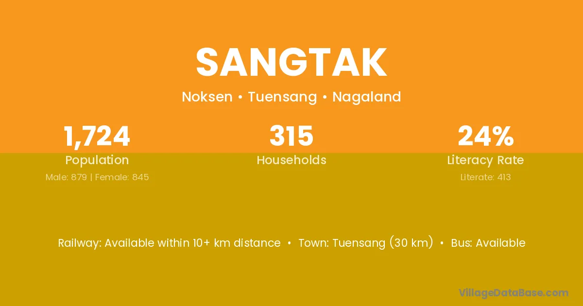 Tuensang (30 km) is the nearest town to Sangtak village for major economic activities and is located approximately 30 km away.