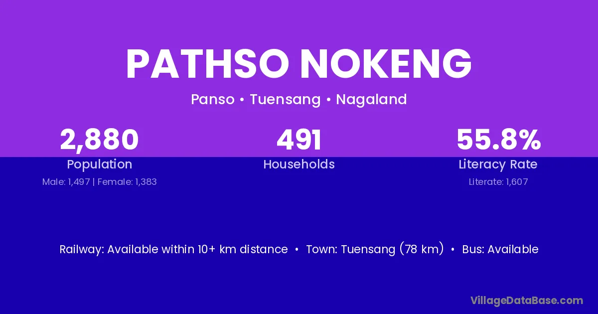 Tuensang (78 km) is the nearest town to Pathso Nokeng village for major economic activities and is located approximately 78 km away.