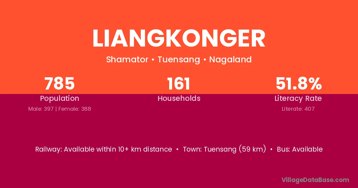 Tuensang (59 km) is the nearest town to Liangkonger village for major economic activities and is located approximately 59 km away.
