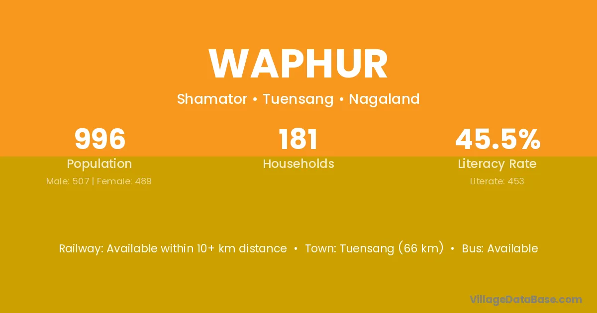 Tuensang (66 km) is the nearest town to Waphur village for major economic activities and is located approximately 66 km away.