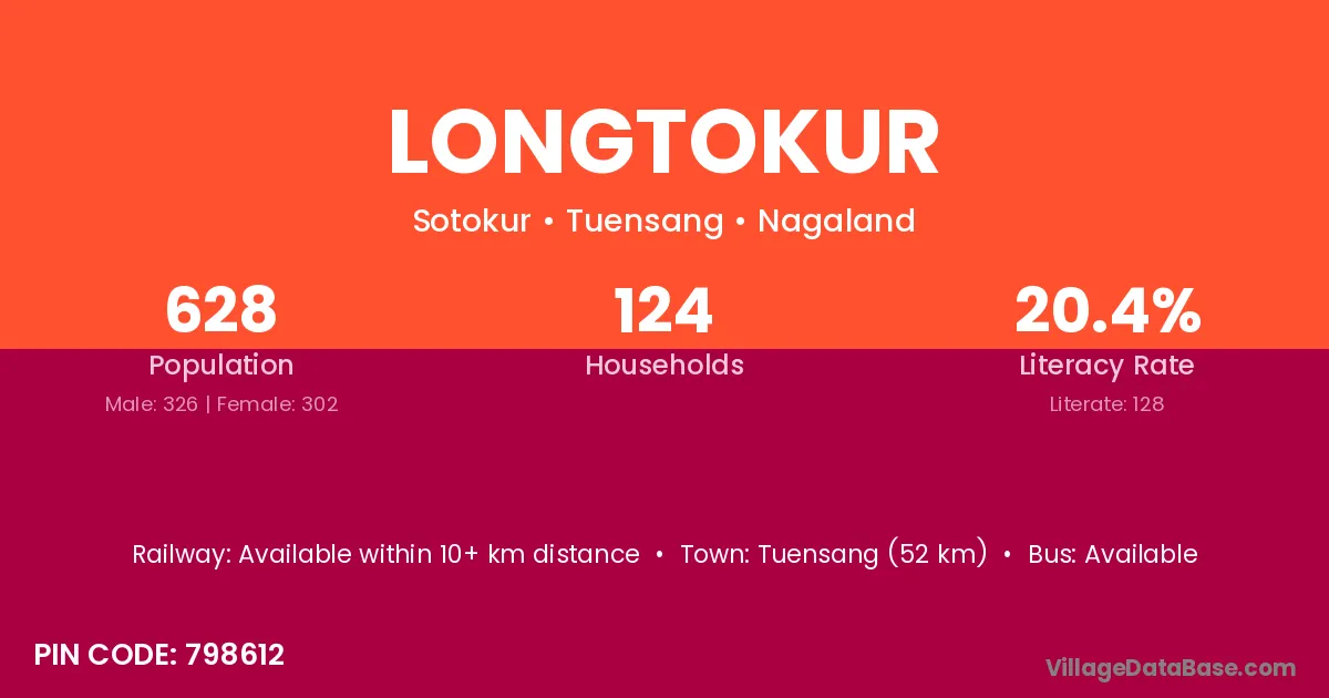 Tuensang (52 km) is the nearest town to Longtokur village for major economic activities and is located approximately 52 km away.