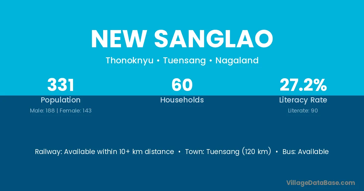 Tuensang (120 km) is the nearest town to New Sanglao village for major economic activities and is located approximately 120 km away.