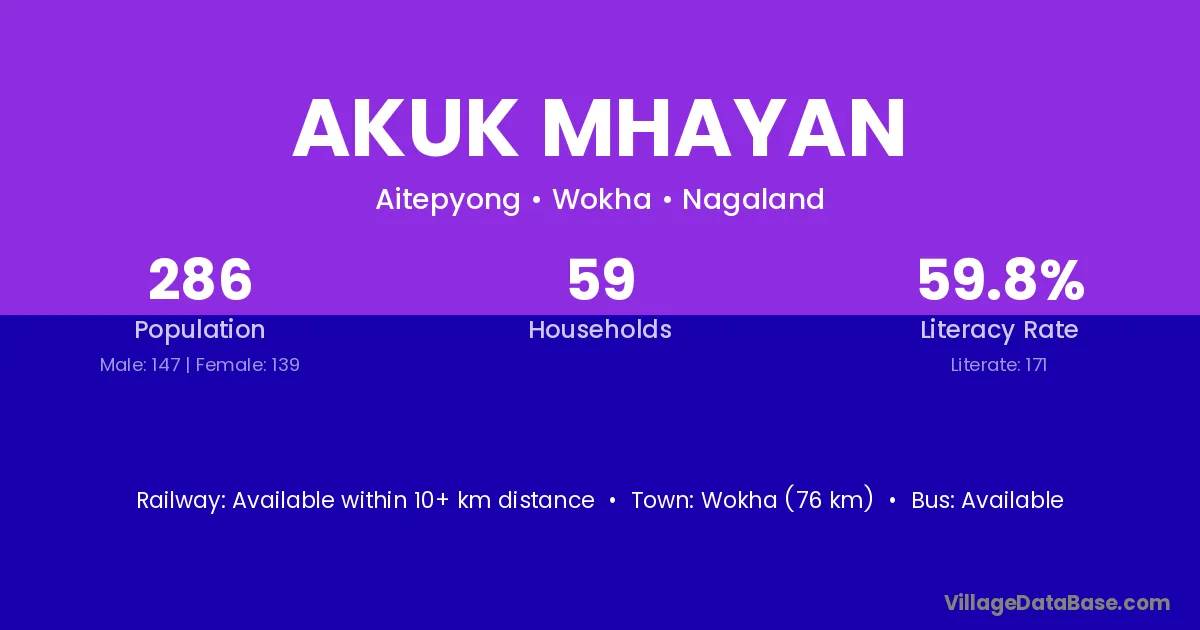 Wokha (76 km) is the nearest town to Akuk Mhayan village for major economic activities and is located approximately 76 km away.