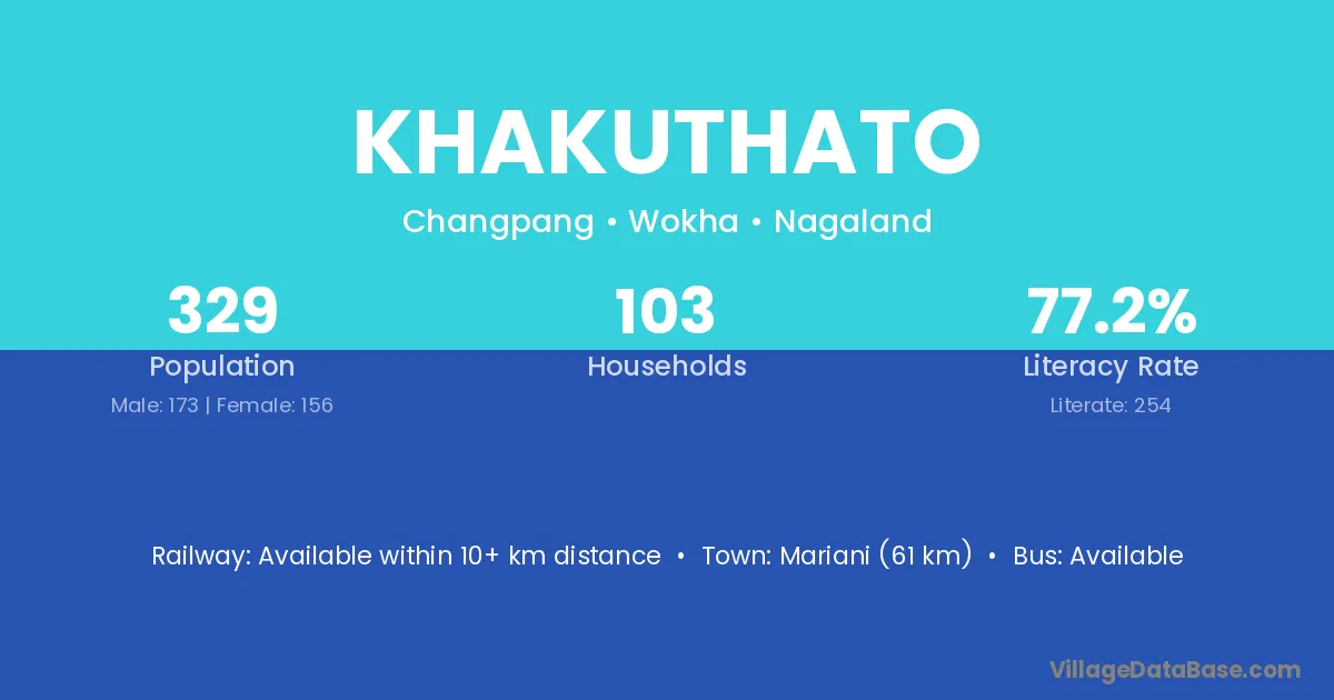 Mariani (61 km) is the nearest town to Khakuthato village for major economic activities and is located approximately 61 km away.