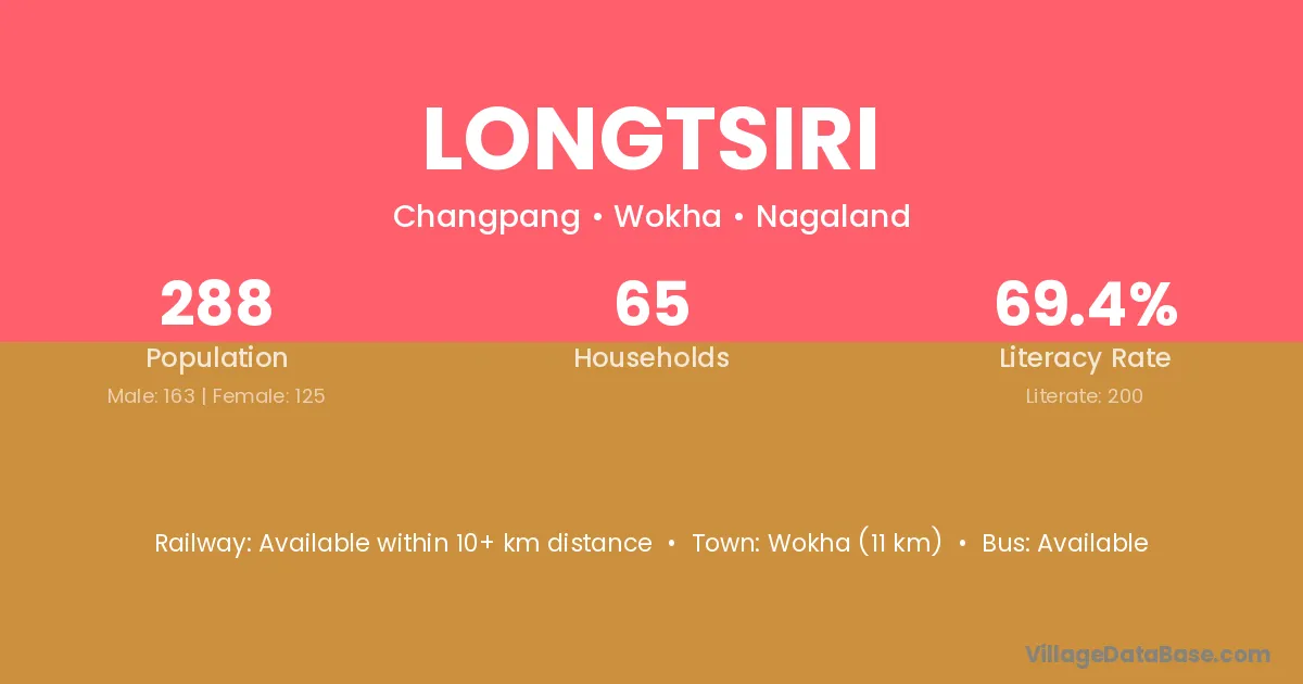 Wokha (11 km) is the nearest town to Longtsiri village for major economic activities and is located approximately 11 km away.