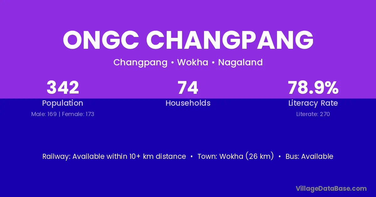 Wokha (26 km) is the nearest town to Ongc Changpang village for major economic activities and is located approximately 26 km away.