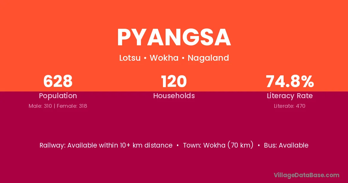 Wokha (70 km) is the nearest town to Pyangsa village for major economic activities and is located approximately 70 km away.