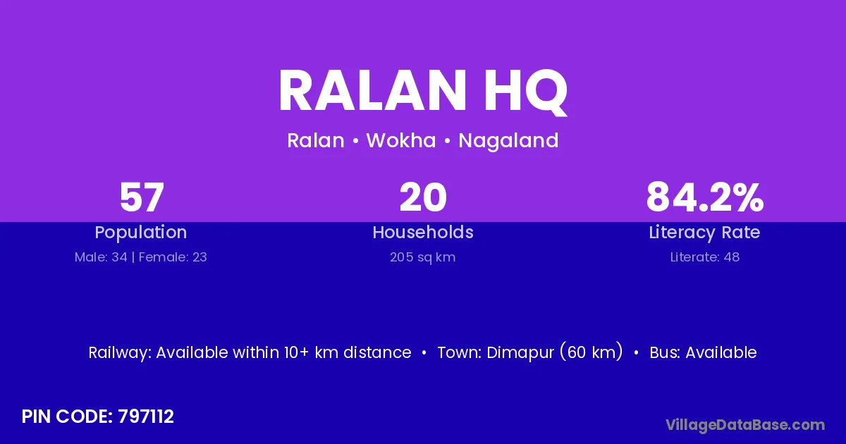 Dimapur (60 km) is the nearest town to Ralan Hq village for major economic activities and is located approximately 60 km away.
