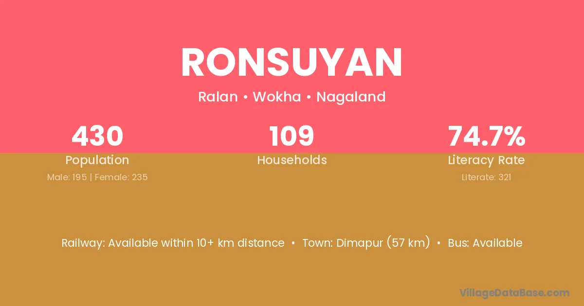 Dimapur (57 km) is the nearest town to Ronsuyan village for major economic activities and is located approximately 57 km away.