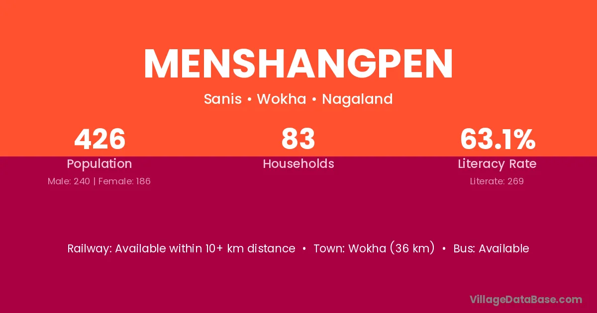 Wokha (36 km) is the nearest town to Menshangpen village for major economic activities and is located approximately 36 km away.