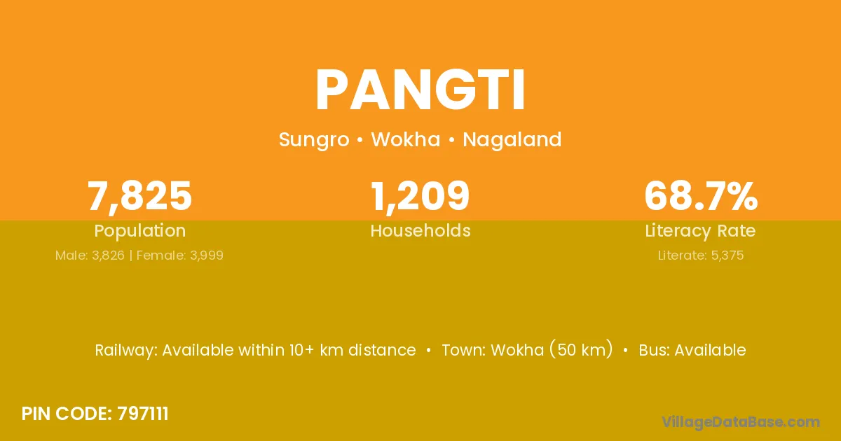 Wokha (50 km) is the nearest town to Pangti village for major economic activities and is located approximately 50 km away.