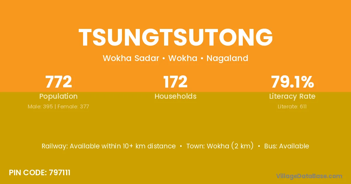 Wokha (2 km) is the nearest town to Tsungtsutong village for major economic activities and is located approximately 2 km away.