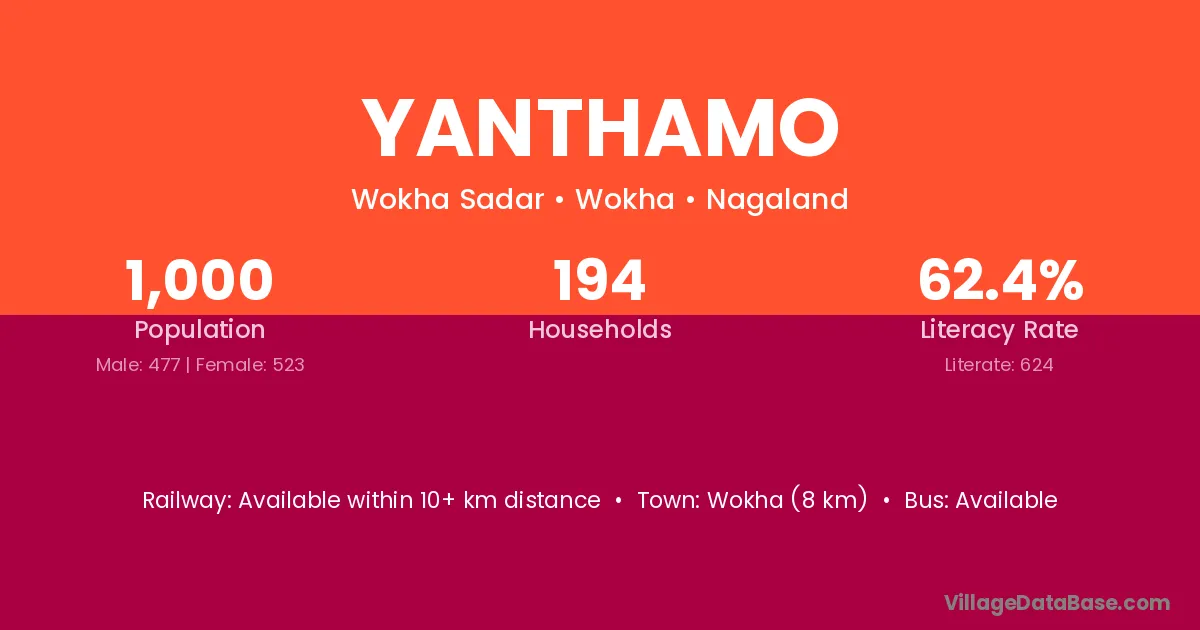 Wokha (8 km) is the nearest town to Yanthamo village for major economic activities and is located approximately 8 km away.