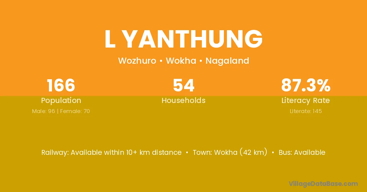 Wokha (42 km) is the nearest town to L Yanthung village for major economic activities and is located approximately 42 km away.