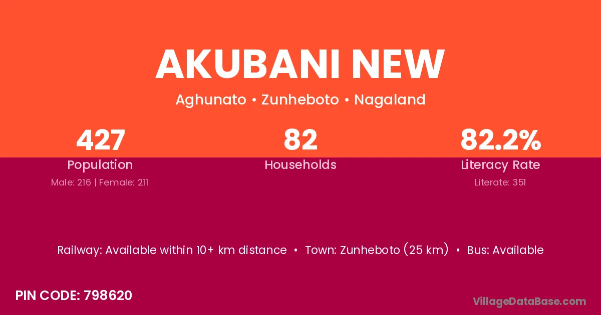 Zunheboto (25 km) is the nearest town to Akubani New village for major economic activities and is located approximately 25 km away.