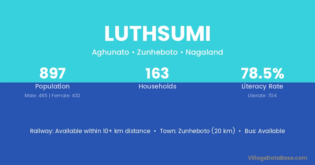 Zunheboto (20 km) is the nearest town to Luthsumi village for major economic activities and is located approximately 20 km away.