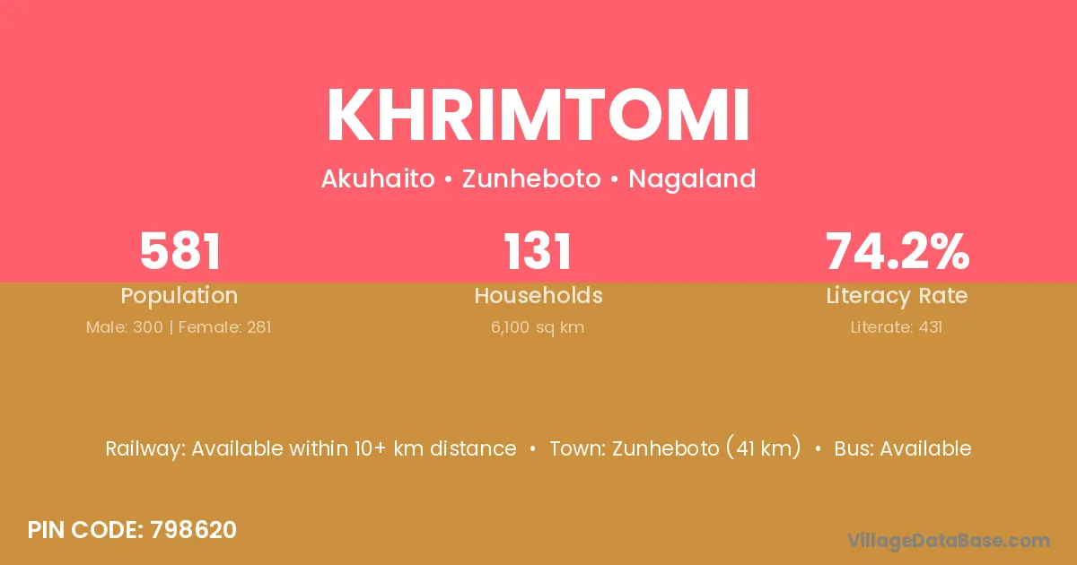 Zunheboto (41 km) is the nearest town to Khrimtomi village for major economic activities and is located approximately 41 km away.