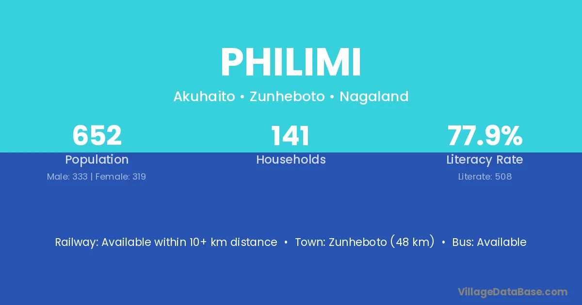 Zunheboto (48 km) is the nearest town to Philimi village for major economic activities and is located approximately 48 km away.