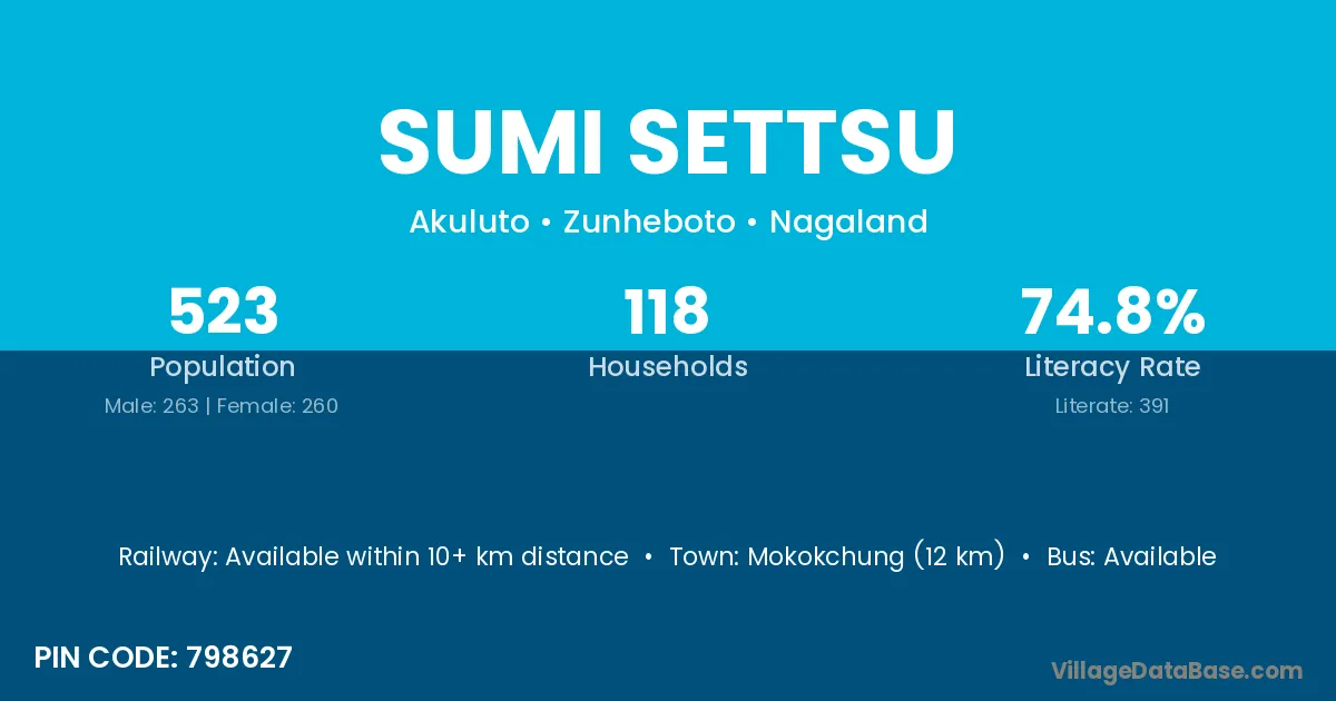 Sumi Settsu village has a total population of 523 people, of which 263 are males and 260 are females.