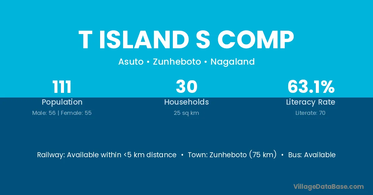 Zunheboto (75 km) is the nearest town to T Island S Comp village for major economic activities and is located approximately 75 km away.